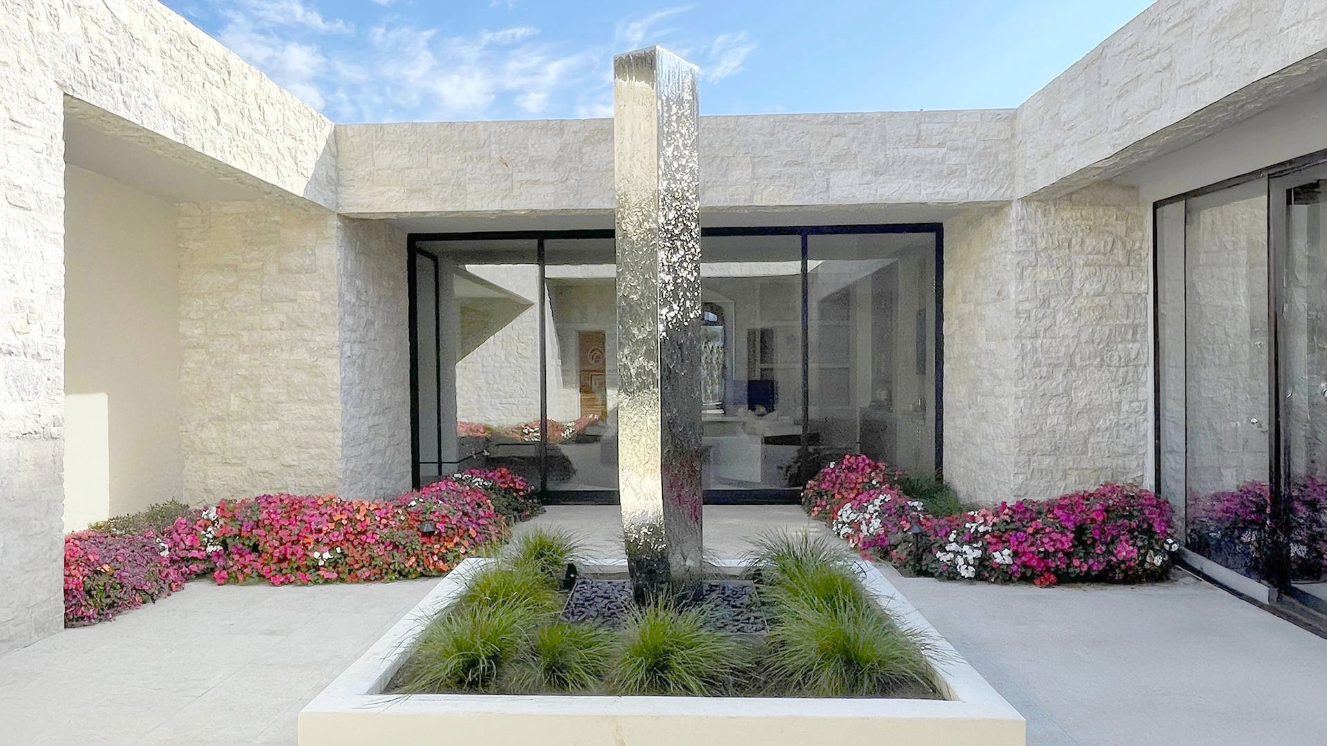 Water Studio’s custom Copper Rivulet Podium feature is covered in this month’s Luxe Magazine’s Explore A Mediterranean-Inspired Oasis In Bel Air by Jessica Ritz and Photographs by Manolo Langis. Two groups of three 4 ft. copper podiums stand nearly 2 ft. tall and span 33 ft. of the home’s central courtyard. Water flows over all sides of the podiums cascading down into a recessed concrete basin. Rivulets of water crisscross at the central podium of each group to bring the sound of falling water into this tranquil outdoor space. The top of each podium creates a still reflecting pool that mirrors the sky, surrounding trees, and interior lighting. A floating stone paver is set between the podium groups to continue the flow of movement through the water feature.