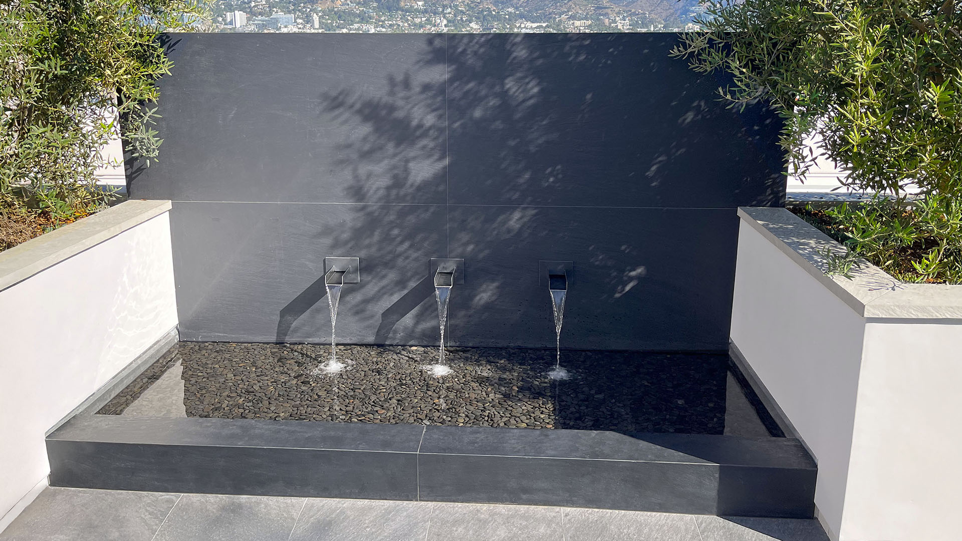 Three curved water veils, spanning 17 ft. wide, appear to interlock as they alternate directions. Each veil is accentuated by three underwater lights, which illuminate the falling water and highlight the wave patterns. The water feature is situated in a raised planter bed and is visible from both the home’s interior and the exterior walkway. The water veils provide a unique sense of tranquility to this modern home, which overlooks the Riviera golf course in Pacific Palisades, CA.